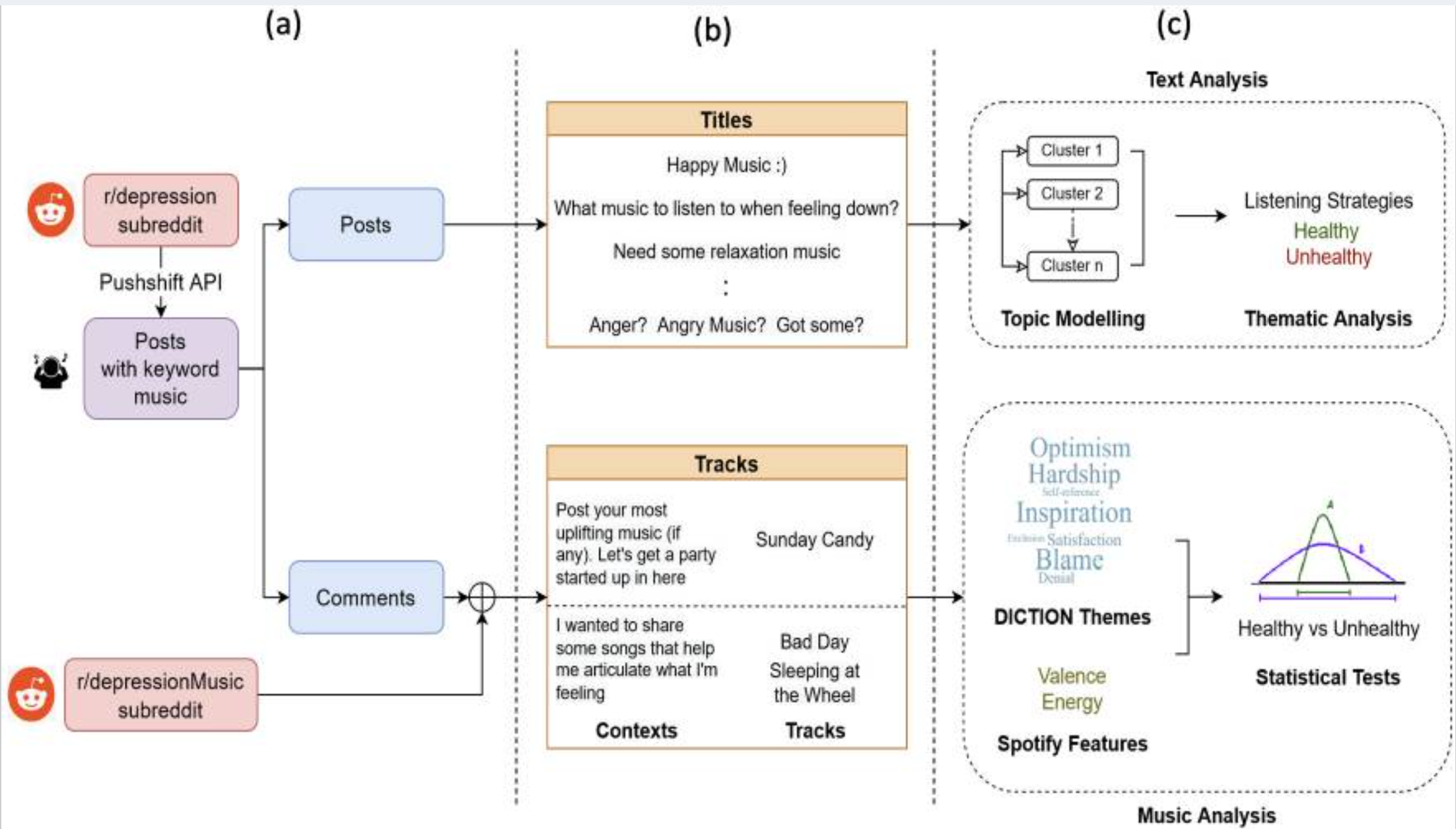 Applied BERT-based sentiment analysis and k-means clustering to uncover nuanced links between language and acoustic music features in data scraped from mental health related subreddits during COVID-19. This research contributed to understanding the relationship between music and mental health through computational methods.